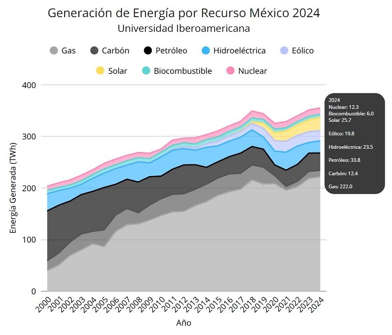 En el país se generan alrededor de 350 TWh de electricidad al año, de los cuales cerca del 77 % proviene de fuentes fósiles, principalmente a partir de gas natural (222 TWh). Esta estructura no es marginalmente fósil: es un sistema que depende de los hidrocarburos para operar todos los días.