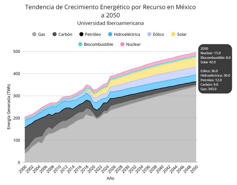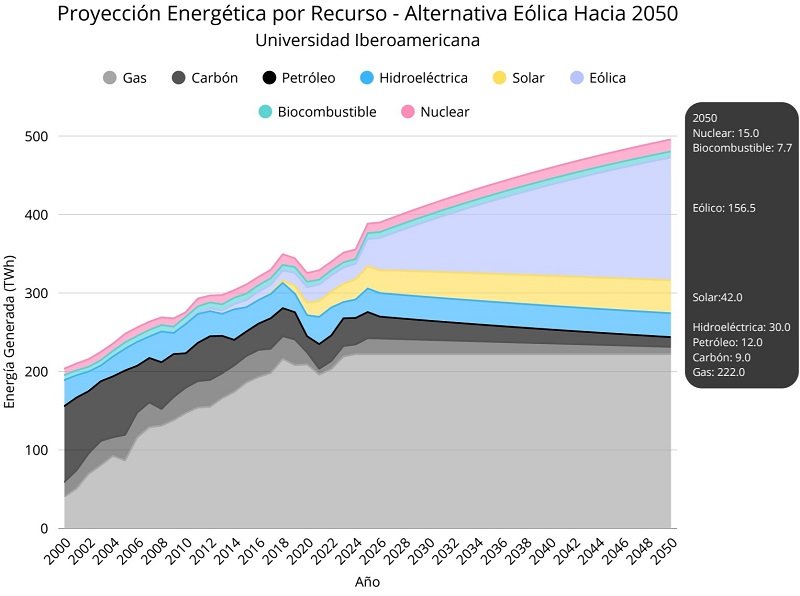 Gráfica 3. Proyección de crecimiento de Generación Eléctrica México a 2050 – Compensación con energía eólica. Universidad Iberoamericana 2026.